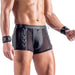 These striking black pants blend matte finish with sheer net panels, creating an edgy aesthetic that commands attention. The innovative open back design pairs perfectly with the included soft handcuffs, while strategically placed restraint rings on the waistband and sides offer endless customization. A functional zip pouch adds practicality to the daring design.